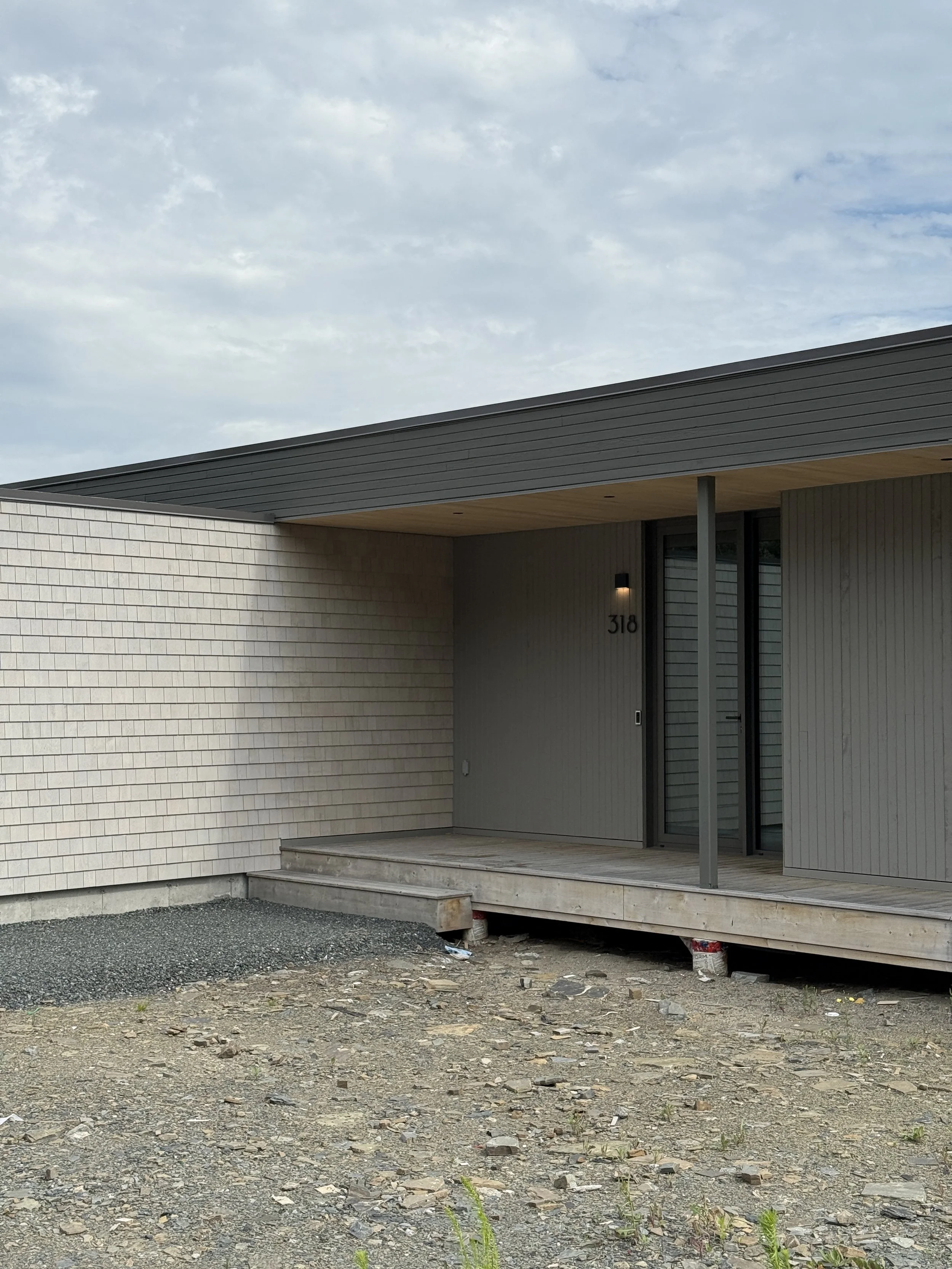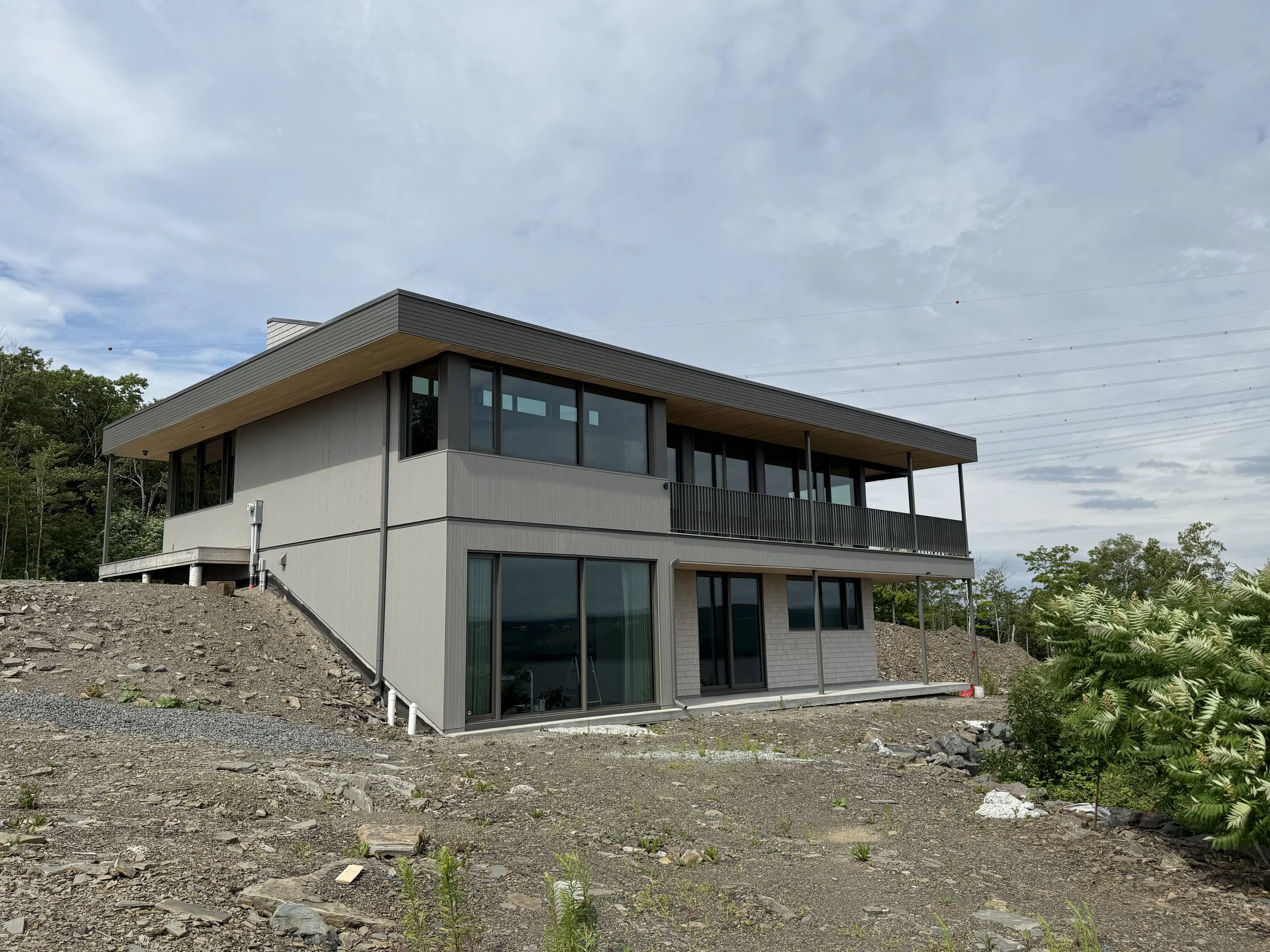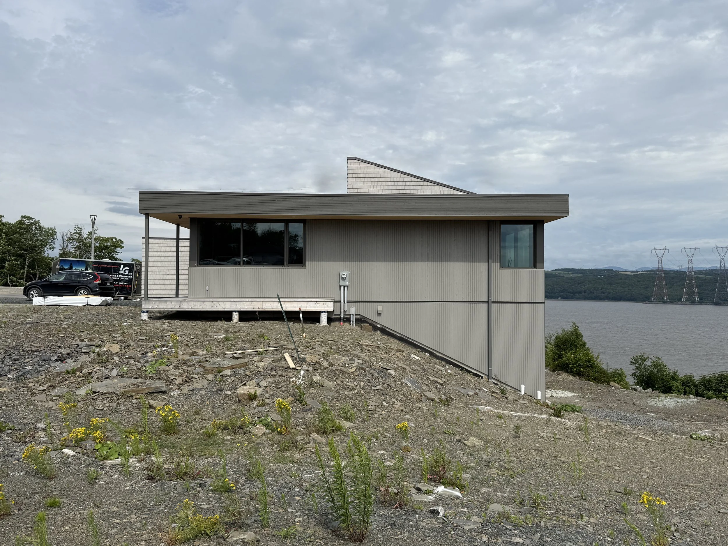 Juchée au haut d’une falaise qui borde l’Anse de Vincennes, la maison de Beaumont offre une vue impressionnante sur l’estuaire du fleuve et l’Ile d’Orléans. Le profil de la maison est bas puisque le terrain en pente permet de réaliser un étage en rez-de-chaussée et un étage en rez-de-jardin qui est largement fenestré vers le fleuve. Une grande lucarne permet de faire entrer la lumière du sud dans un grand espace ouvert au rez-de-chaussée.